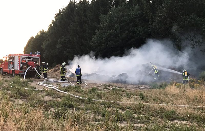 Das Brandgut wurde abgelöscht, von dem THW mit dem Kran auseinander gehoben und mit einem Traktor abtransportiert.