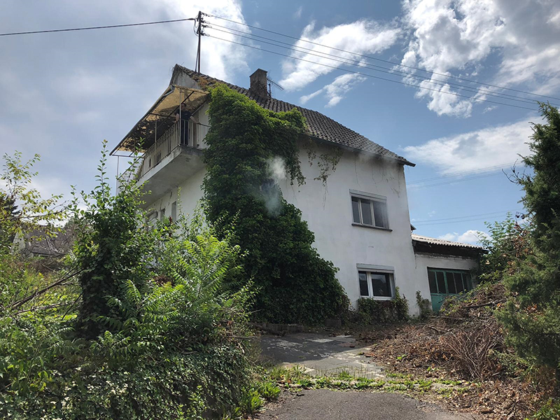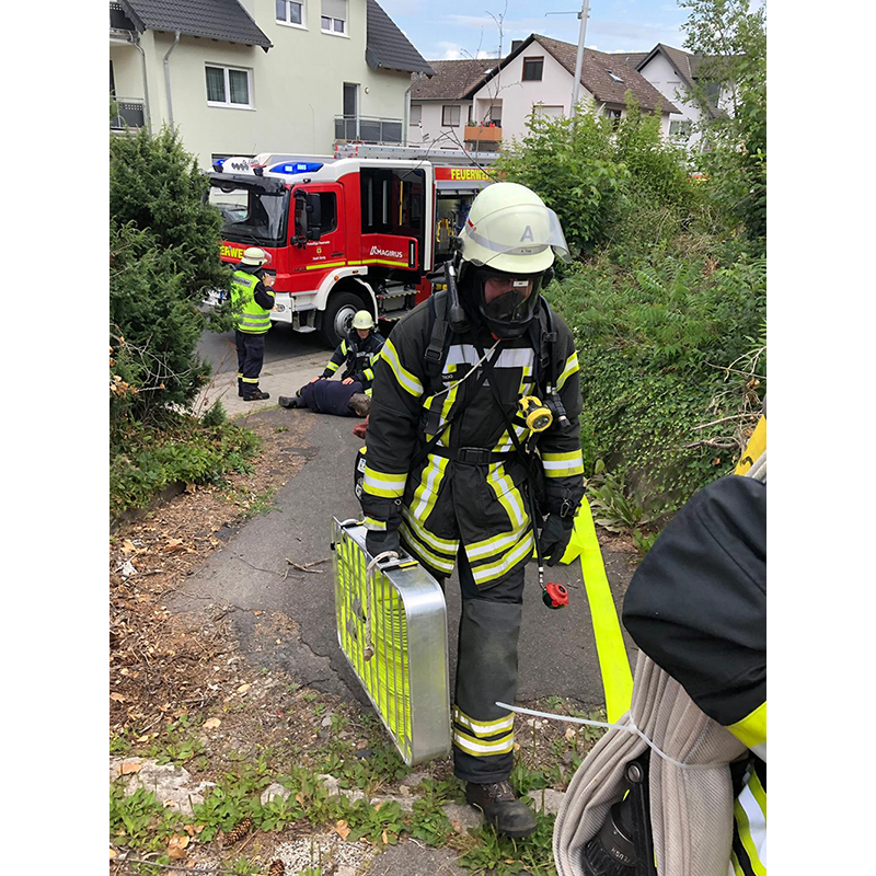 Als Szenario wurde ein Brand in einem Einfamilienhaus mit Personenrettung simuliert. Hier wurde die Rettung über die Steckleiter sowie mittels Fluchthaube geübt.