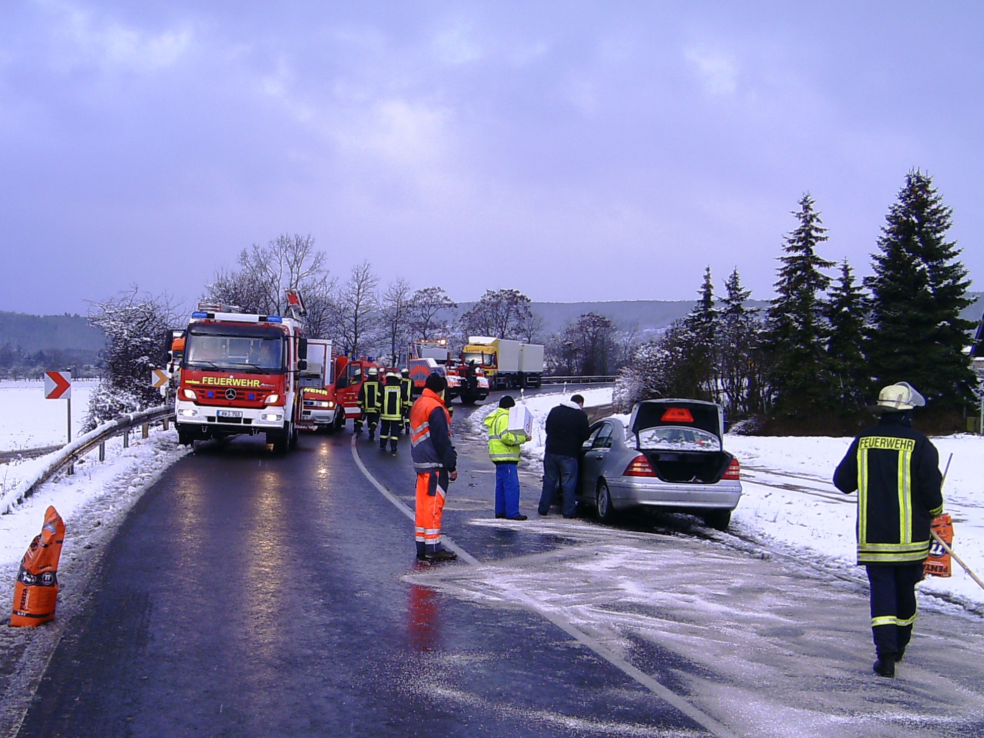 Als Erstmaßnahme streuten die Einsatzkräfte die Fahrbahn ab. Bei einem Folgeunfall zwischen zwei PKW waren Betriebsmittel ausgelaufen. An den Fahrzeugen entstand Blechschaden. Aus dem Tank des verunglückten LKW lief kein Kraftstoff aus. Zum Bergen der persönlichen Gegenstände des Fahrers kletterte ein Feuerwehrmann über zwei Steckleiterteile in das Führerhaus. Da befürchtet wurde, dass beim Aufrichten des Fahrzeugs der Tank beschädigt werden und Diesel auslaufen könnte, ergriff die Feuerwehr entsprechende Vorsichtsmaßnahmen. In das Erdreich wurde eine Grube gegraben, mit einer Folie ausgelegt entstand eine Aufwangwanne die mit Bindemittel gefüllt wurde. Nun richtete ein Kran die Zugmaschine mit Hilfe einer Seilwinde wieder auf und hob den LKW anschließend wieder auf die Straße. Da sich der Aufbau bei dem Unfall teilweise von dem Fahrgestell gelöst hätte, konnte er so nicht abgeschleppt werden. Mitarbeiter einer Werkstatt trennten den Aufbau von dem Fahrgestell, wonach er gesondert abtransportiert wurde.