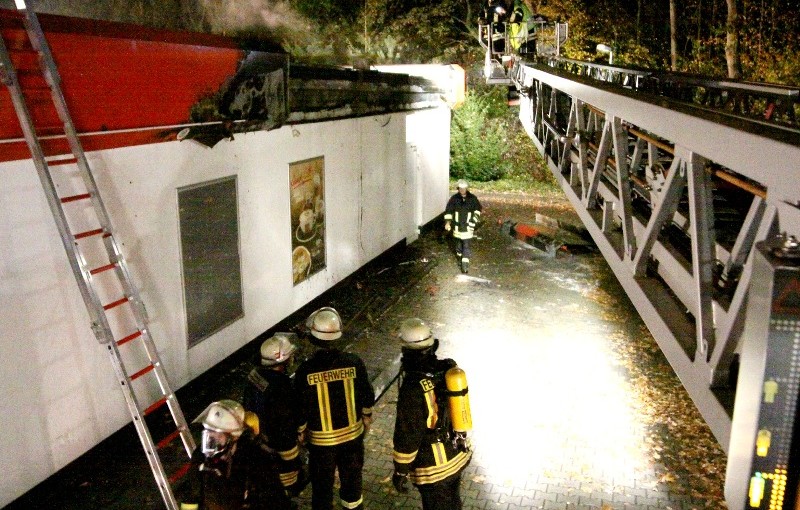 Hinter der Blechverkleidung des Flachdaches schlugen ihnen die Flammen entgegen. Mit einem Strahlrohr konnte das Feuer aber schnell unter Kontrolle gebracht werden, so das kein weiterer Schaden mehr entstand. Es hatte sich bereits bis in die Dämmung ausgebreitet. Von der Drehleiter aus kontrollierten die Einsatzkräfte den Bereich noch mit einer Wärmebildkamera auf weitere Schwelbrände, fanden aber keine mehr.