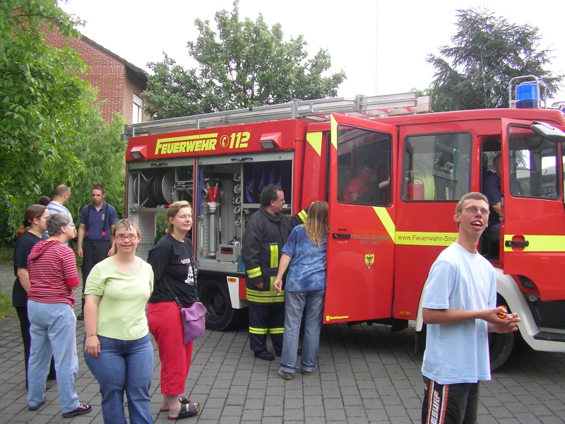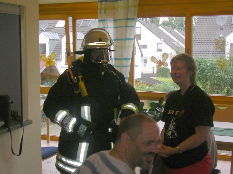 Durch das praktische Ausprobieren und Anfassen, aber auch durch das Hören des Atemgeräusches und Funkgerätes sollten die Bewohner langsam an die für sie ungewöhnlichen Eindrücke herangeführt werden. Den Abschluss bildete dann die Besichtigung des mitgebrachten Feuerwehrfahrzeuges dar. Für alle Beteiligten war dieser Abend eine sehr schöne Veranstaltung, die vorallem den Bewohnern viel Spaß bereitete, auch wenn ein paar Ängste vorhanden sind. Von Seiten der Brandschutzerziehern der Feuerwehr und Betreuern besteht aber weiterhin reges Interesse an einer weiteren Zusammenarbeit, die zukünftig hoffentlich langfristig ausgebaut werden kann.