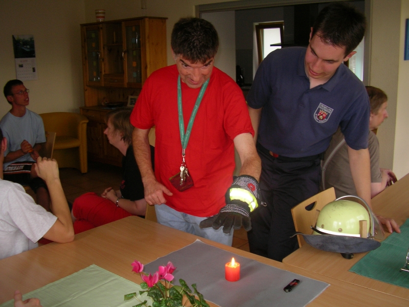 In drei Gruppen mit jeweils zwölf Bewohnern und zwei Brandschutzerziehern unterhielte man sich zunächst über die Gefahren die von einem Brand ausgehen. Dabei zeigten die Feuerwehrleute dann die jeweilige Schutzkleidung, die von der Feuerwehr deswegen im Einsatz getragen werden muss und erklärten die Funktionsweise. Mit Hilfe einer Kerze demonstrierte man praktisch den Unterschied der empfundenen Wärme mit der bloßen Hand und mit einem Feuerwehrhandschuh.